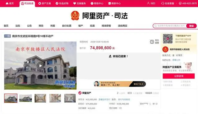 南京玄武区钟山高尔夫一套建筑面积约1323平方米的独栋别墅,以7489.86万元底价法拍成交,成为南京法拍史上最贵单套住宅。该房产评估价超1亿元,需承担欠缴物业费30余万元及其他费用,引发市场关注。