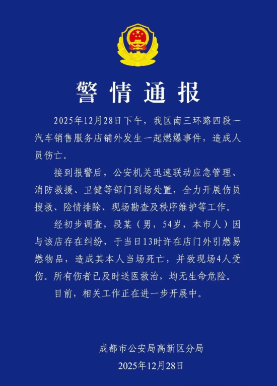 2025年12月28日,成都高新区一4S店外发生燃爆事件。据成都高新警方通报,事件系54岁男子段某因与店铺纠纷蓄意纵火引发,导致其本人死亡及现场4人受伤。目前伤者均无生命危险,调查工作正在进行中。